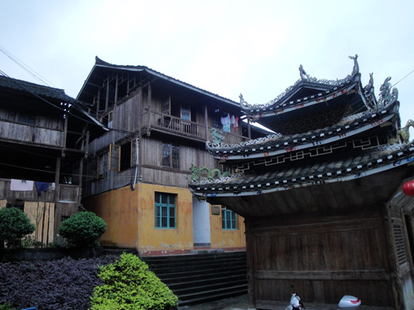 寨里建有兩坐鼓樓,相距二十米,分別為頭寨鼓樓和尾寨鼓樓,有人稱之為龍鳳鼓樓。位于現(xiàn)戲臺兩側(cè)。鼓樓是侗族特有的民族文化象征和標志。哪里有侗族,哪里就有鼓樓。鼓樓飛閣垂檐,內(nèi)部由四根巨大的杉木貫頂,與周圍的木柱、橫梁組成復雜的網(wǎng)狀結構,層層而上呈寶塔形狀。侗族建筑師技藝高超,幾十米高的鼓樓建造不用圖紙,主材尺度確定后,其它材料的長短按秘傳口訣即可算出,憑著一根丈桿,一支墨筆,錯綜復雜的金瓜梁枋、斗拱支柱,以杉木開糟穿榫插接而成,不用一釘一鉚,銜接絲毫不差,歷經(jīng)風雨,百年不倒。為了裝飾、防腐,在鼓樓的外額上彩繪或泥塑龍鳳鳥獸、古今人物,以及侗族生活風情的油飾圖案,造型栩栩如生,內(nèi)容琳瑯滿目。鼓樓是侗族人民娛樂、儀事的公共場所,為侗族多元文化之載體。樓中最高層的中心擺設一樺樹牛皮大鼓,凡有重大事宜商議,起款定約,則擊鼓以號召群眾。