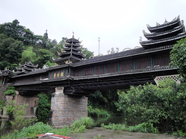 要到侗寨必須先過一座名為普修橋的風雨橋,該橋橋坐落于坪坦河上,始建于清乾隆年間,后毀于洪水,清嘉慶八年(1812)重修,1984年復修,2007年3月寨民對橋體進行維修。橋全長57.7米,寬4.2米,等分成21廊間,橋廊兩側(cè)設置通長直欞窗,四柱三間排架,橋身為重檐長廊,分設三座橋亭,橋兩端各設一橋門,橋門為重檐歇山頂。兩邊橋亭為三重檐,方形平面歇山頂式,中間橋亭有七重密檐,下三層為方形平面,上四層為八角攢尖葫蘆頂。1988年,通道侗族自治縣人民政府行文公布為縣級文物保護單位,1989年公布法定保護范圍和建設控制地帶?,F(xiàn)在主要功能為新寨與外界聯(lián)系的紐帶和村民休閑娛樂場所。