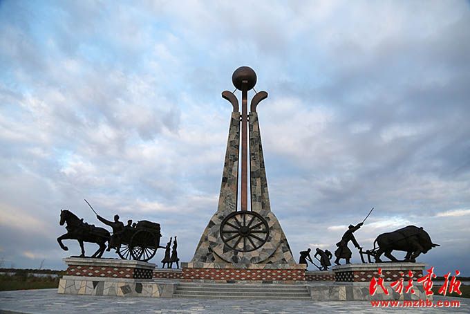 黑河市愛輝區(qū)坤河達(dá)斡爾族滿族鄉(xiāng)富拉爾基達(dá)斡爾族南遷廣場(chǎng)上的雕塑反映了達(dá)斡爾族在黑龍江畔開墾土地,建設(shè)家園的情景。