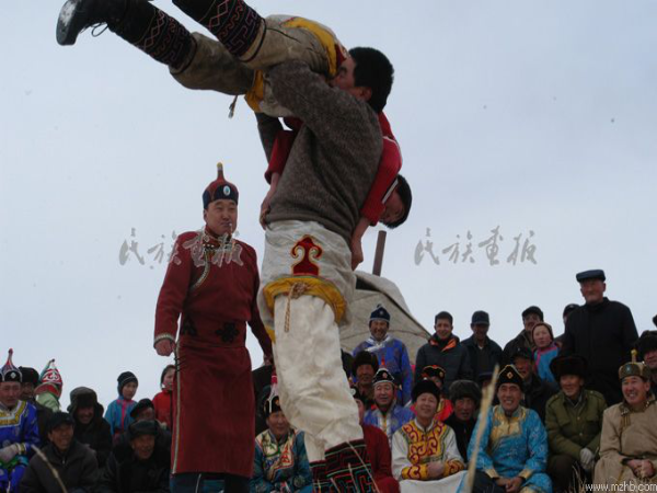 春節(jié),蒙古人稱為“白節(jié)”、“大年”,是蒙古人傳統(tǒng)節(jié)日,時間在農(nóng)歷正月初一。居住在農(nóng)村、城市、工礦區(qū)的蒙古族過春節(jié)的習(xí)俗同漢族差不多,但牧區(qū)有許多不同的特點。除夕之夜為“守歲”,合家老小席地坐在蒙古包中的矮桌周圍,桌上擺著一盤盤香噴噴的肉類、奶食品,以及糖果、香煙、美酒等物,有的還要在矮桌上供一張大紙,紙上寫著祖先的名字。午夜,開始飲酒吃年飯,或吃除夕餃子。按規(guī)矩團(tuán)圓之宴要多吃多喝酒、肉,食器要擺滿滿一席。如吃不完也要剩得越多越好,象征新的一年里吃喝不盡、年年有余。家里的年輕人,要向長者敬“辭歲酒”。特別有意思的是全家共吃一塊由酥油、糖、白面烙成的大圓餅,這叫吃新年餅,每人只吃一口,意思是全家永不分離,永久團(tuán)圓,永遠(yuǎn)過甜甜蜜蜜的日子。除夕之夜要耍“嘎拉木”(玩羊骨頭)、說書、唱歌、跳舞,通宵達(dá)旦,熱鬧一宿。過大年,按習(xí)慣還要拜年,大年三十晚上為辭舊歲禮, 初一早上為迎新年,晚輩給父母和老人叩頭、敬酒、獻(xiàn)哈達(dá),祝老人們身體健康,晚年幸福!老人擁抱孩子們,并斟上一碗鮮奶,祝愿子女們幸福,像牛奶一樣純潔。大年初一早餐后,男女盛裝,三五成群來到浩特(村鎮(zhèn)),挨家串戶給親友拜年。客人進(jìn)屋首先向長輩叩頭拜年,祝愿老人身體健康,年豐人壽。按習(xí)慣由主人家的女婿向客人逐個敬酒,每敬必喝,或邊喝邊唱,邊唱邊舞。