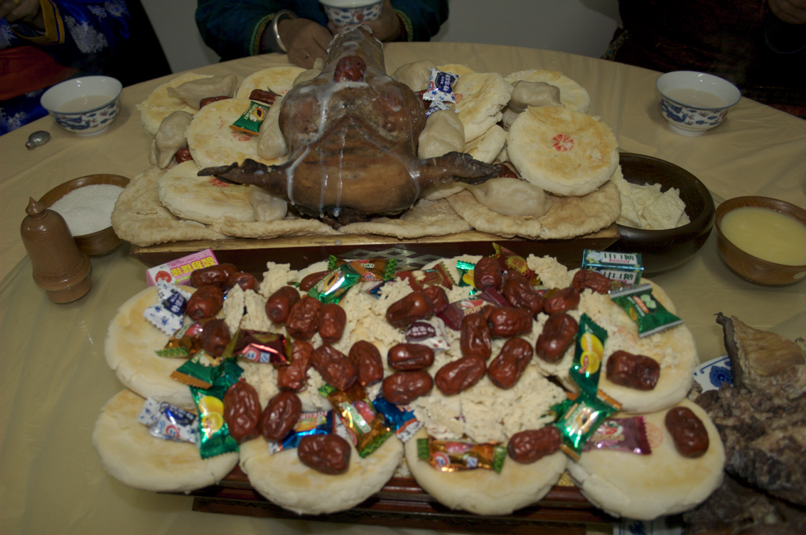全羊席,又稱整羊席(蒙古語為“布禾勒”或“酥斯”),是蒙古人招待貴賓的傳統(tǒng)佳肴,也是蒙古民族最古老、最隆重的一道宴席,一般只在盛大宴會(huì)、隆重集會(huì)、舉行婚禮或接待高級(jí)貴賓時(shí)擺設(shè)。將整羊加工后擺在長(zhǎng)方形的大木盤里,像一只臥著的羊,肉味鮮美,香飄滿堂。賓客在進(jìn)餐前,還要舉行一定的儀式,高唱贊歌,朗誦獻(xiàn)整羊祝詞等。據(jù)文獻(xiàn)記載,成吉思汗曾設(shè)過全羊宴。忽必烈登基時(shí),也設(shè)全羊宴祭神祇、待賓客。至清代全羊宴更加盛行,現(xiàn)已成為蒙古民族風(fēng)格接待貴賓的名貴菜肴,馳名中外。