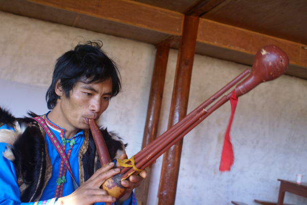 傈僳族民間器樂藝術具有獨特的民族風格和特色,在傈僳族民間音樂中有重要地位。其種類主要有琵琶(劉軍攝)、口弦、竹笛、葉笛、葫蘆笙(劉軍攝)、二胡等。