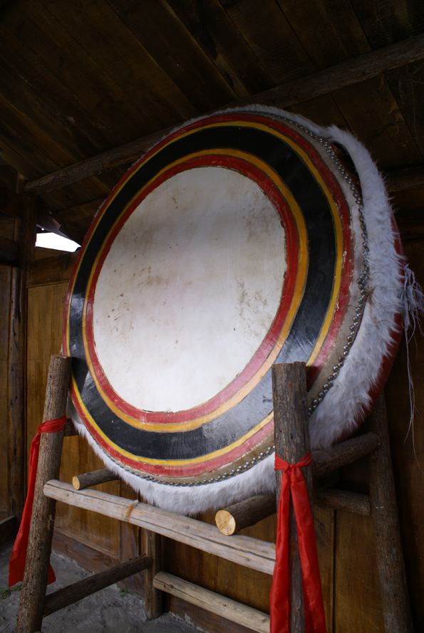 羌族羊皮鼓是打擊樂器,又名“羌鈴鼓”,羌語稱“切歐?!薄扒袩釀e日木”。有兩種形狀,一種是圓形鼓面的鈴鼓,直徑大約30—40厘米。鼓邊寬約15厘米,鼓柄置于正中,抓柄的長度與鼓面的直徑相同,左手從背面握柄。另一種是扇子形狀的鈴鼓,鼓框和鼓柄為鐵制,抓柄端有一裝飾環(huán)圈,圈內串以數(shù)個銅錢。兩種形制鼓面均蒙羊皮,各鼓音高低不一,鼓錘為竹制,敲擊的一端略微呈弓形。羊皮鼓的打法和鼓點的節(jié)奏變化豐富。目前,搜集到的有硬三鞭、軟三鞭、野雞撲、偷點子、牛擦癢等十多種。這些鼓點穿插在每個唱段與舞蹈銜接變化中,使表演者在統(tǒng)一的步伐、統(tǒng)一的動作中,調節(jié)了節(jié)奏氣氛。由于表演具有即興式特點,表演者的技術嫻熟程度和思想情緒變化將直接影響技巧的發(fā)揮。羊皮鼓突出鼓的表演,氣氛熱烈歡快,動作粗獷質樸,如“禳星辰”動作,就是在鼓點、唱腔、動作的有機結合中,表現(xiàn)出凜冽的氣勢。羊皮鼓在表演中,不僅給舞蹈提供了節(jié)奏,豐富了氣氛,而且鼓點的擊打更形成和衍化出許多獨特的舞蹈語匯。