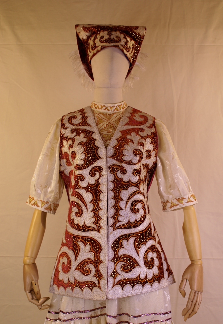 俄羅斯族女性的服飾則更多的體現(xiàn)了女性美,她們?cè)谥卮蠊?jié)慶或節(jié)日時(shí)會(huì)穿上絲綢質(zhì)地的繡花襯衣,外面再套穿一件無(wú)袖、腰身較高的對(duì)襟長(zhǎng)衫,下身一般穿著毛織長(zhǎng)裙。俄羅斯族女子也十分喜愛穿長(zhǎng)筒皮靴或氈靴。俄羅斯族女性的發(fā)飾也視年齡的不同而有所差異,少女梳獨(dú)辮,把彩色發(fā)帶和小玻璃球編在辮子里,頭發(fā)可外露。已婚婦女則梳兩條辮子,盤于頭頂,再用頭巾或帽子罩上。
