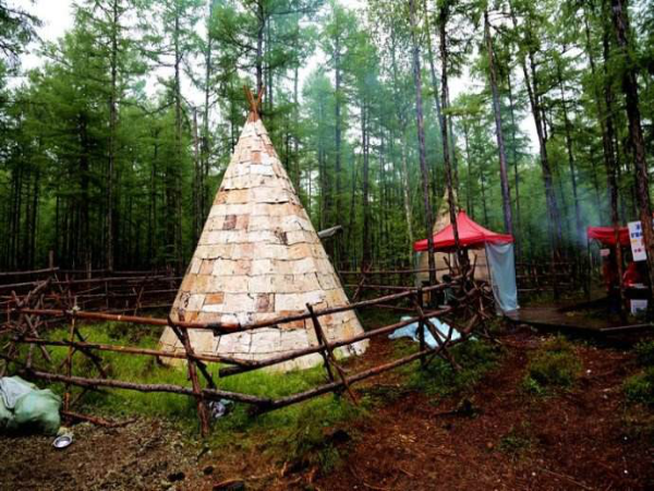 撮羅子的選址,是在地勢(shì)較高、陽(yáng)光能照射到而且水和柴草就近可取的平坦之處。其蓋造方法,是用三五根約碗口粗細(xì)上有枝杈的木桿,相互交合搭成上聚下開(kāi)的骨架,然后再用30根左右木桿搭在骨架之間捆綁固定,在南面(或東面)留出門,即基本成型。木桿搭起的只是“屋架”,外面還要覆蓋才能遮風(fēng)擋雨。按照季節(jié)的不同,分別用樺樹(shù)皮、草簾子和犴、狍等獸皮,做成自上而下一層壓一層的圍子,綁在木桿上,門簾則夏用草或樹(shù)條編,冬用狍皮做成。
