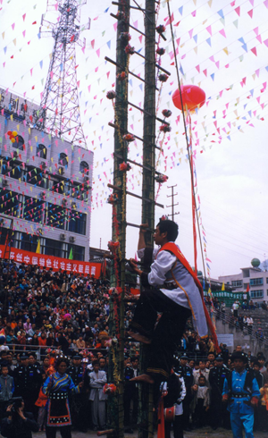 節(jié)日里,婦女們穿著鑲花邊的黑色上衣和點(diǎn)綴著各種銀飾物的花裙,佩戴耳環(huán)、項(xiàng)鏈等首飾,風(fēng)采奪人。男人穿著麻布短衣褲,腰系紅黃長帶,小腿系吊簡,腰佩長刀,肩挎箭包,英姿勃勃。節(jié)目的廣場上,堅(jiān)趄兩根二十米高的樹干,四周用藤蔓拉緊固定,樹桿上插有三十六把明晃晃的長刀,作為向上攀登的橫檔,刀刃向上,寒光逼人,謂之“刀竿午間。鞭炮齊鳴,鑼鼓震天”。身穿大紅抱、頭纏紅布包頭、赤腳的五名“玩火者”,齊涌至竿下,圍繞刀竿唱歌跳舞,將斟滿的白酒一飲而盡,縱身飛上刀竿。雙手緊提刀面,運(yùn)足氣的腳掌斜置在鋒利的刀刃上,勇敢、靈巧地向上攀登。全場鴉雀無聲,大家屏住呼吸仰面觀看,對他們的氣功絕技贊嘆不已。噼噼啪啪的鞭炮聲來自竿頂優(yōu)勝者,響徹云霄。全場歡呼跳躍,爭相向爬桿者敬獻(xiàn)美酒。對歌、跳舞、蕩秋千活動(dòng)為節(jié)日增添了濃郁的氣氛。丟煙包(煙盒)活動(dòng)別具一格,青年男女各站一方,互擲煙包,姑娘將小伙的煙包收藏起來,說明姑娘接受了小伙子的愛慕。