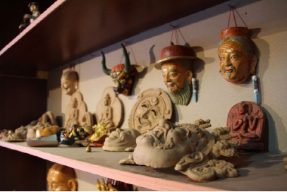 在普布次仁所在的公司里,有一個(gè)專門用來制作泥塑面具的房子,從外表上看去,它只是一個(gè)普普通通的藏式民居,但走進(jìn)其中,則別有一番天地。在房間里整齊擺放了大大小小的泥塑面具、佛像,這些手工藝品造型生動,每一件手工藝品仿佛都在訴說著一個(gè)古老、動人的故事。
