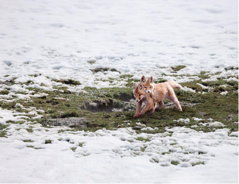 藍天白云,微風(fēng)輕漾;草地碧綠,鳥語花香。大自然的美景圖正在小赤狐的家園四周徐徐展開。在膽大的小赤狐的叫喚聲里,躲在洞內(nèi)的另外兩只小赤狐也壯著膽子探出頭來。不一會兒,它們習(xí)慣了周圍的環(huán)境,三只小赤狐在離洞口5米遠的范圍內(nèi)嬉戲玩耍著。它們時而跳躍,時而奔跑,展現(xiàn)出本能的捕獵動作。稍大一點的小赤狐騎在小一點赤狐的背上嬉戲玩耍,小赤狐也不示弱,奮力反擊,猶如兒童打鬧,其樂無窮。那烏黑溜圓的眼睛彎了又彎,毛茸茸的尾巴高高地翹起,身體嬌小,惹人喜愛,讓人看了會產(chǎn)生想上去抱一抱、摸一摸小赤狐身軀的念頭。